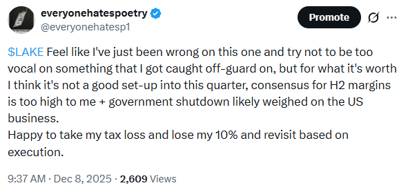 Growth but with dilution: the main fear is they issued 2M shares at $22 raising money to pay down the debt from the 4 acquisitions they made, and to give them dry powder to keep growing. I don’t believe LAKE will be a serial diluter, especially in ways that aren’t accretive.